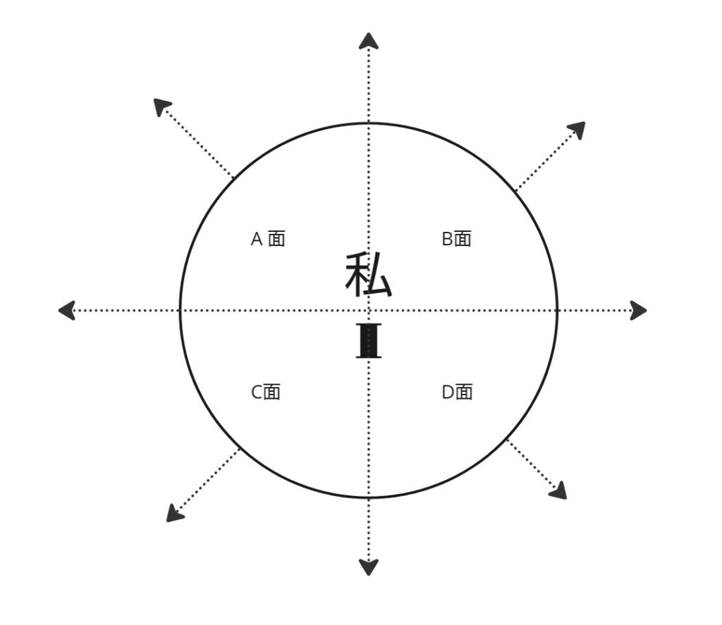 より詳しく視ようと眼鏡をかけたとしても点による観測であって、その個人の自然体から離れてフィルターを通した具体化であるのでフレーム内に注視してしまう。これにはAとDがあてはまる。BはBの知り得ぬ目標に向かって邁進している私を捉えている。近所の顔なじみのおじさんおばさんや、組織内の一般的先輩後輩の間柄に中る。Cにおいては長い時を共に過ごした家族や友人といった身の内で、共有することが多いことから円のように包括して私を観測している。DとAの相違は私のどこに着目しているかであり、願いの過程や目標などの本末の末ではなく根本を視ており、カウンセラーや占い師の類といった技術者は私自体を視ている。
