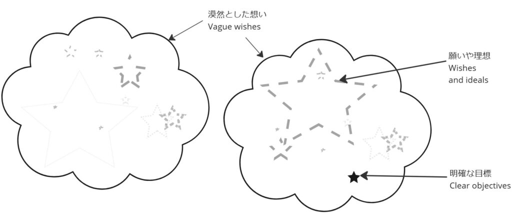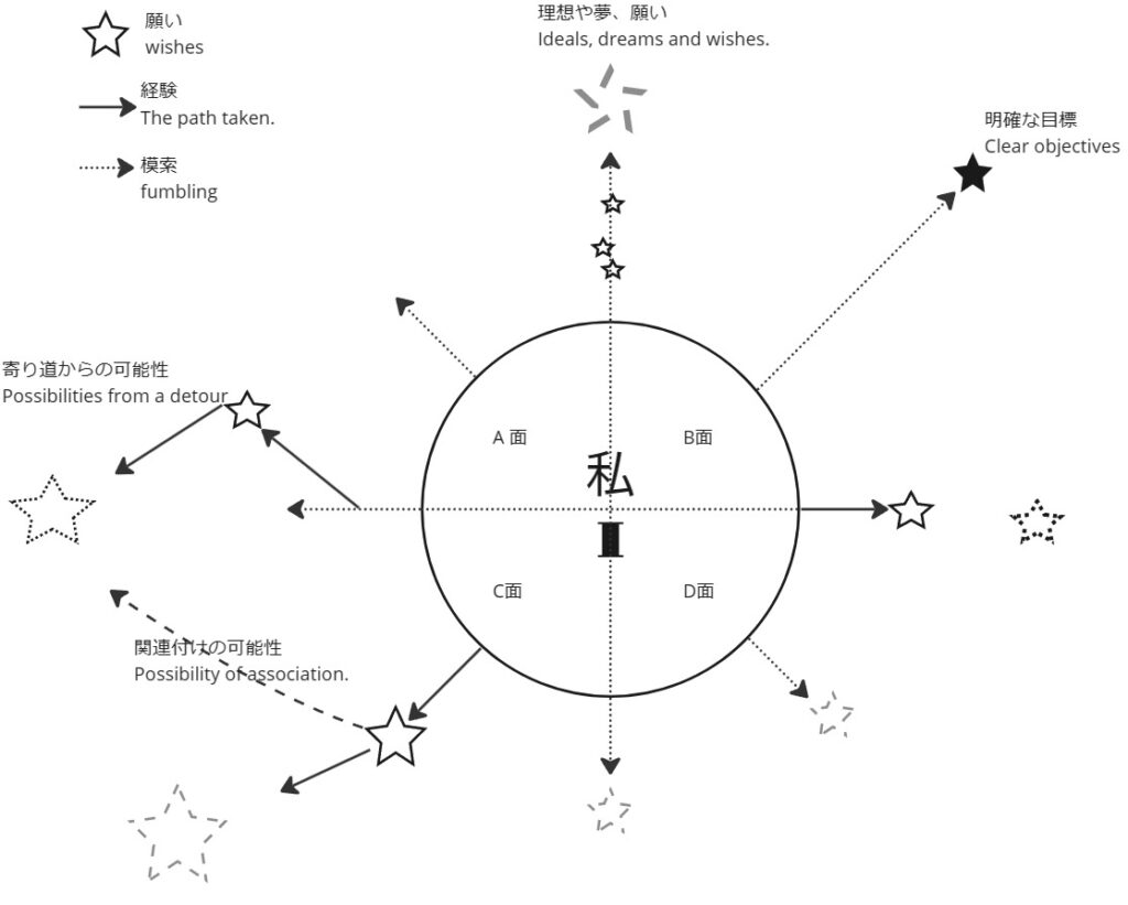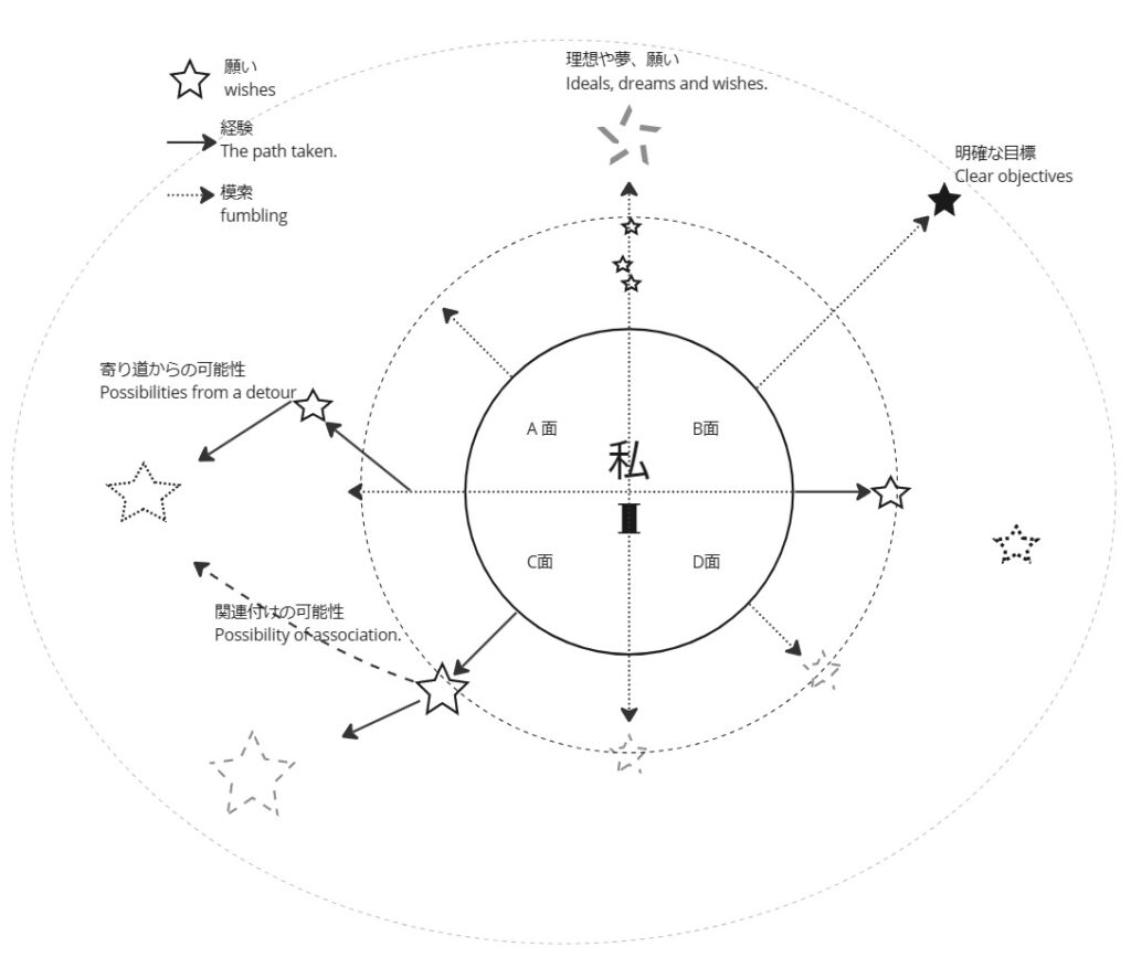 図化するとたいへん解りやすいが、願いに由って目指す星が顕れる。”顕”の漢字は日の下に糸が通じている様を視ており、この図に近い。願いに対して進んでいくとその過程に達成すべき小さな目標などが現れる。直線経路が遠い道のりであったり諦めて迂回しなければならない道でも、培った別の経験に由って関連付けが可能となる。諦めないことがカギとなるが、諦めたとしても十年後などの長期的、広範囲的視野で懐き続けること、生を諦めないことにより可能性が見出される。願いが達成されても次の願いが生まれることが人の常だ。これは欲とも云うし、欲の元を辿れば生とも云える。願いや欲は諦めても別の願いが生じるので差し支えないが、生きることは羽を広げることや手を伸ばすことであって、それら一切を諦めることはその者にとって時の停止、死への緩やかな衰退に他ならない。