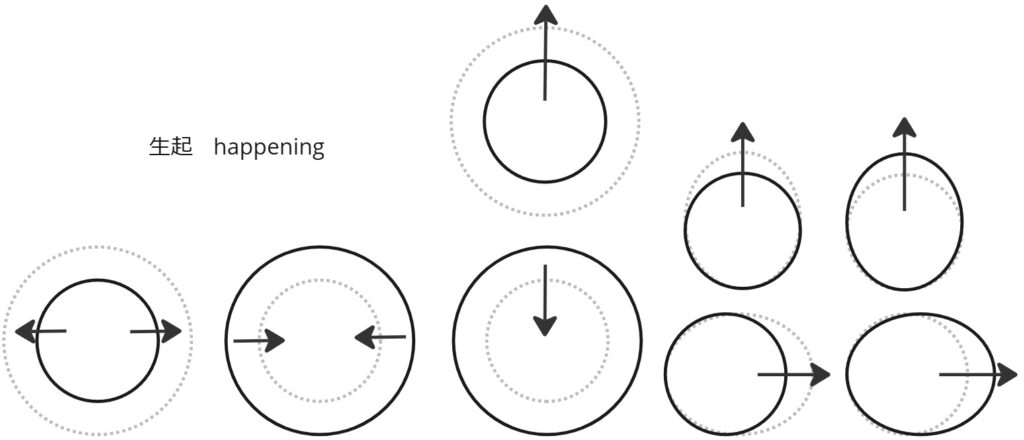 これは身体にたいして、筋肉のつけ方でも、知覚や反射なども同じである。動きが生じるとエネルギーの消費が高いことから疲れやすい。そしてその指向性のもとに動き続けることにより二分化の可能性が顕在化しはじめる。物理でいえば、振れ動く、つまり振動と言い換えることができる。